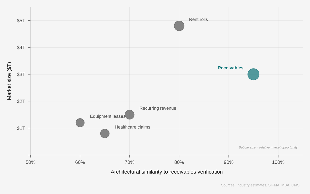 Expansion matters because the same verification problem repeats. Commercial real estate needs rent roll truth. Healthcare finance needs claims verification. Software finance needs recurring revenue quality. Equipment finance needs asset and payment traceability. In each case, capital is still relying on fragmented evidence, periodic reporting, and limited cross system reconciliation. The adjacent market argument should therefore be selective, not exhaustive. Show a handful of markets where the same control logic clearly transfers.