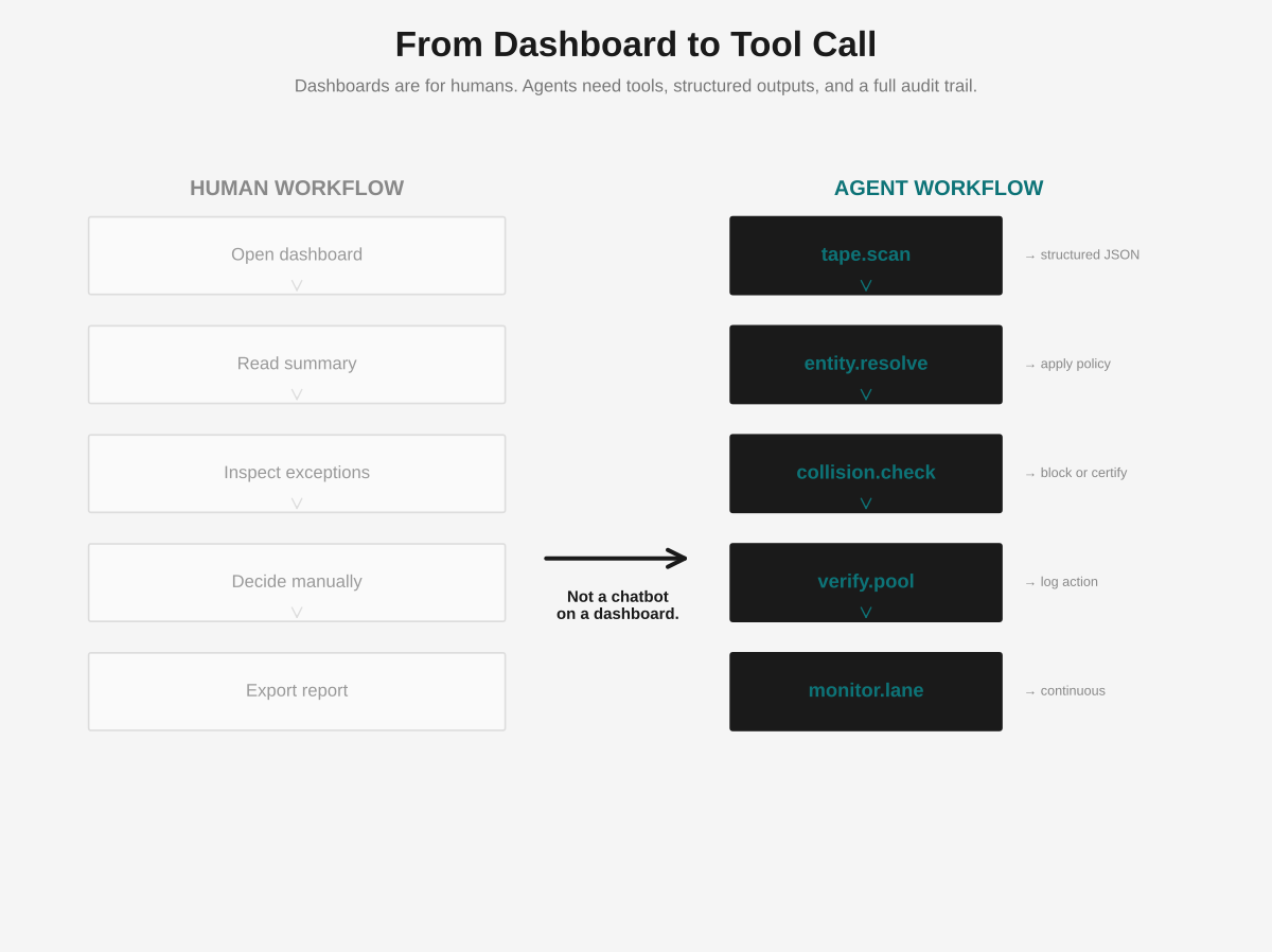 The next user of collateral infrastructure will not be an analyst. It will be an agent executing inside a policy loop. An agent needs callable tools, deterministic outputs, structured state, and a full audit trail for every action. That is why MINT's surface matters. It is not a natural language layer on top of a reporting system. It is a machine callable verification runtime. Tape scan, entity resolution, lien search, collision detection, compliance checks, monitoring, certification, reporting, lane analysis. The system returns structured JSON, executes the verification pipeline, then blocks, certifies, or escalates. Once that exists, collateral integrity moves from dashboard workflow to machine infrastructure.
