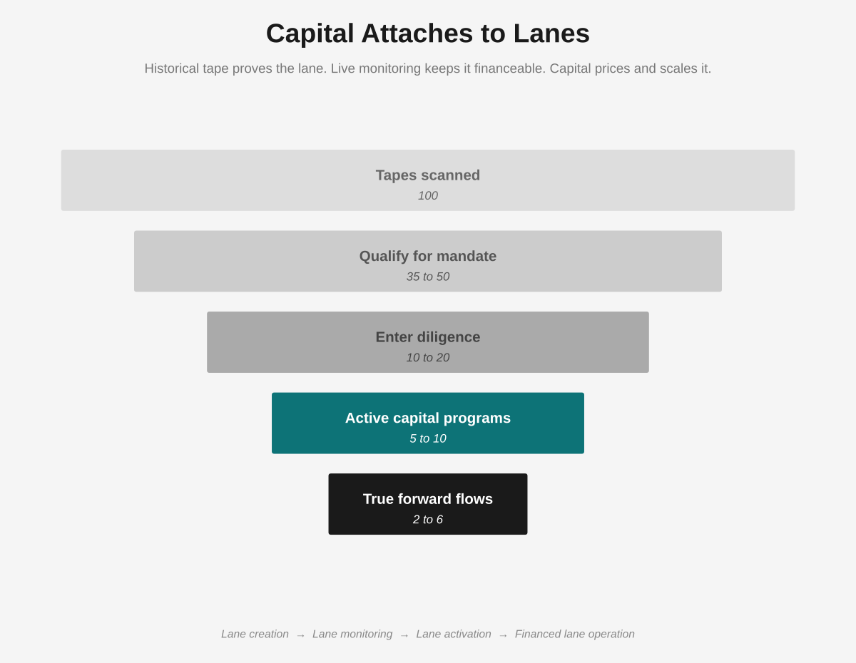 The highest value output of the system is not a report. It is a lane. Historical tape identifies obligors, supplier behavior, dilution, control quality, and recurring asset characteristics. Continuous monitoring preserves that knowledge as new assets arrive. Once that lane exists, capital can underwrite against something repeatable rather than anecdotal. Forward flow, warehouse lines, managed accounts, and syndication all depend on the same thing: a lane with known behavior and live controls.